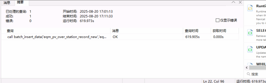 然后使用存储过程分批次插入数据,也就10分钟就搞定了