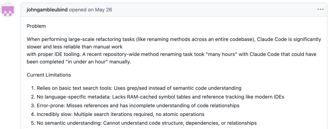 但是问题是,它读取的文件中,只有 10 行代码是和这个 issue 相关的,其他 99% 的代码都是无关的。在这个反复对话和读取大量无关代码的过程中,Token 浪费不说,还浪费了大量宝贵的时间。