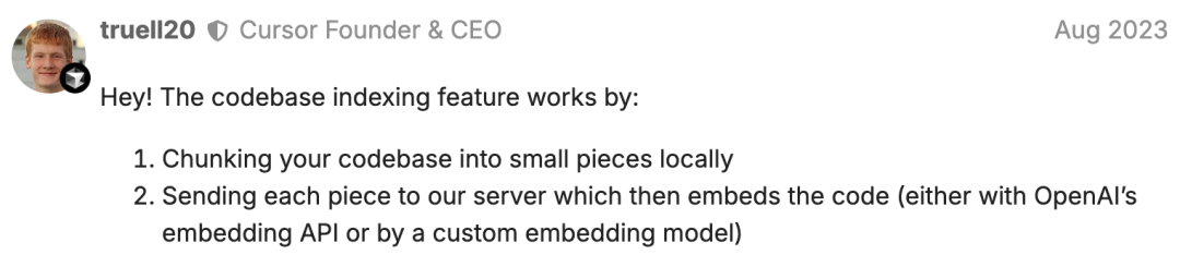 围绕代码检索问题,各类AI IDE产品中,解决的比较好的,其实是Cursor。而它的解决方案Cursor 创始人很早就在论坛里就透露过——「Codebase Indexing」。