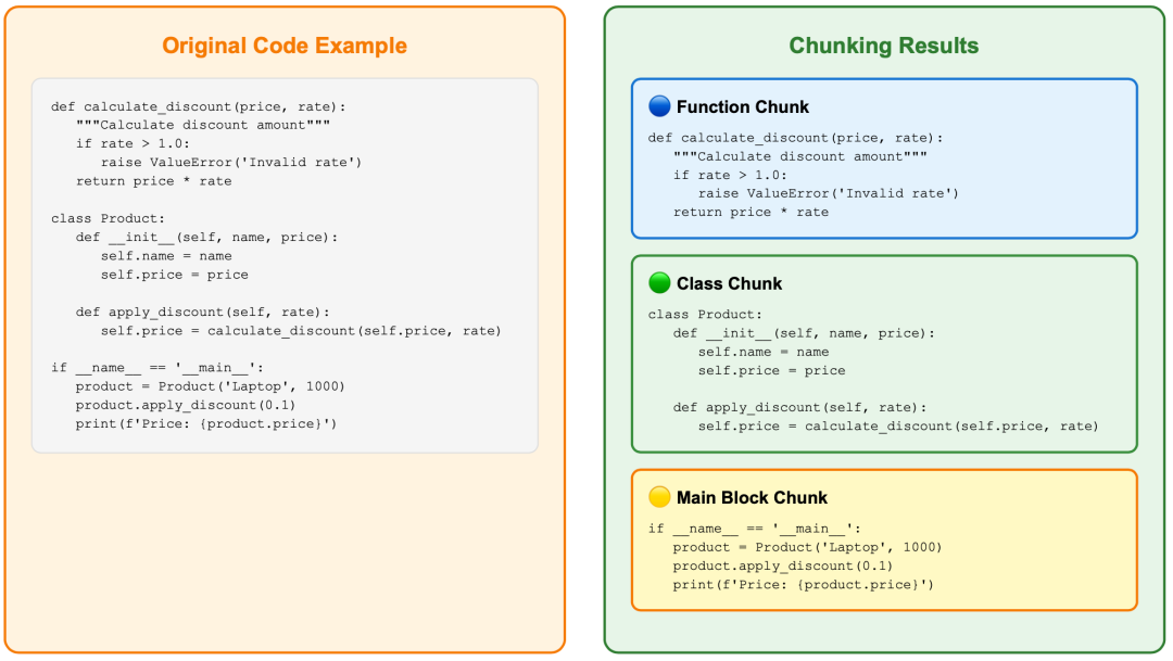 语法完整性:每个 chunk 都是完整的语法单元,不会出现函数被切成两半的尴尬情况