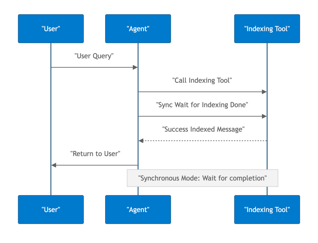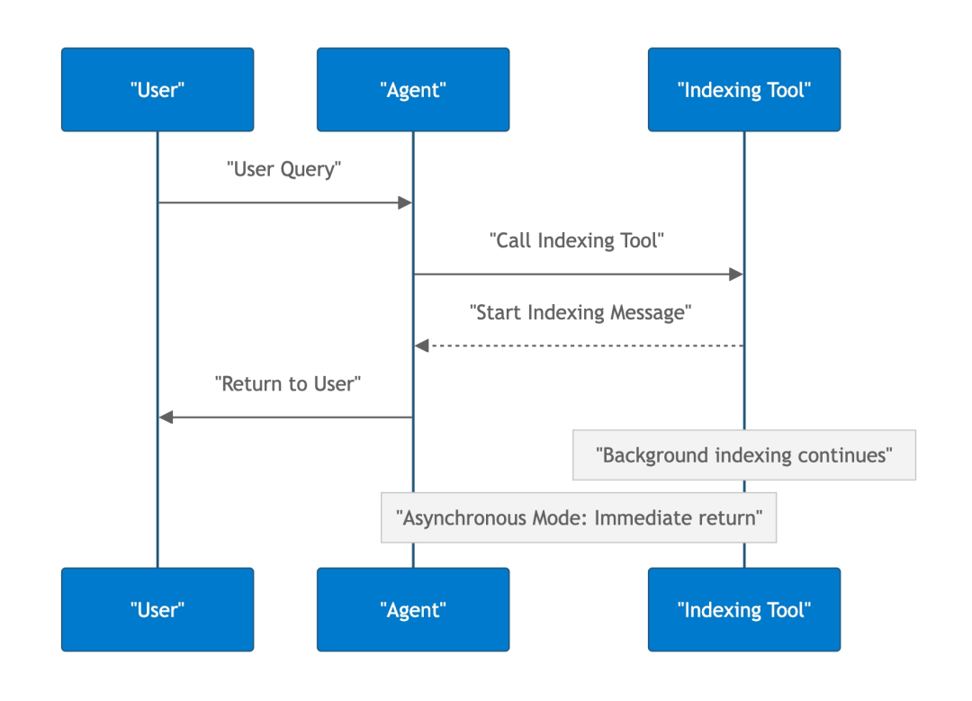 这个很好解决,用一个 tool 来查询 indexing 的进度或状态。后台 indexing 进程异步地将进度暂存下来,用户随时可以查询:进行到 50% 了吗?成功完成了吗?还是失败了?