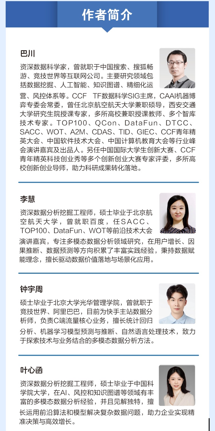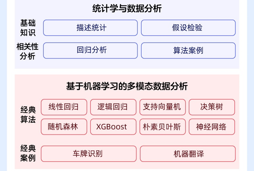 其四,技术纵深:系统覆盖统计分析、机器学习(线性回归、逻辑回归、SVM、随机森林、XGBoost等)、深度学习(CNN、RNN、LSTM、应用与扩展)、知识图谱(构建、融合、企业级应用)及当下最热的大模型(GPT、DeepSeek等)在多模态领域的应用架构与实践。