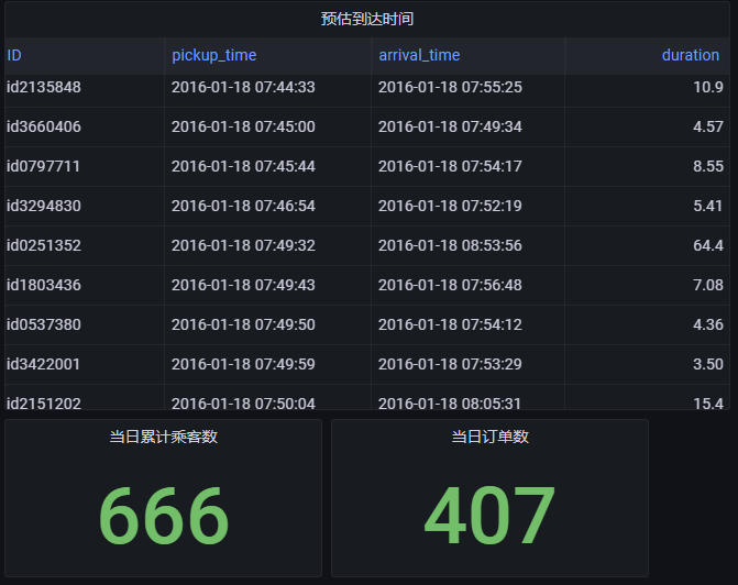 where date(predictTable.pickup_datetime) == date(select max(pickup_datetime) from predictTable) - Query 2:统计当日累计订单数及累计乘客数
