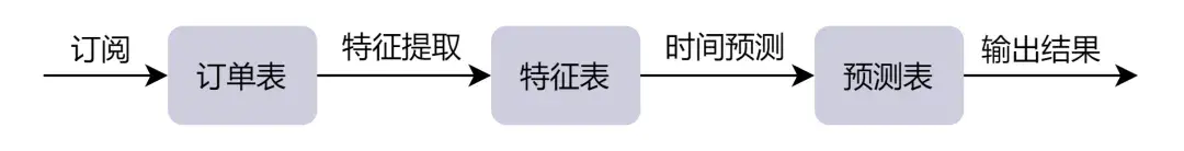 在本例中,特征表需订阅订单表完成原始信息的特征提取。本模型通过自定义 process 函数对订单数据进行清洗和加工,提取出时间、位置等关键特征。随后,预测表需订阅特征表,并调用自定义的 predictDuration 函数完成行程时间预测,该函数会加载预先训练好的模型,对输入特征进行推理并输出预测结果。