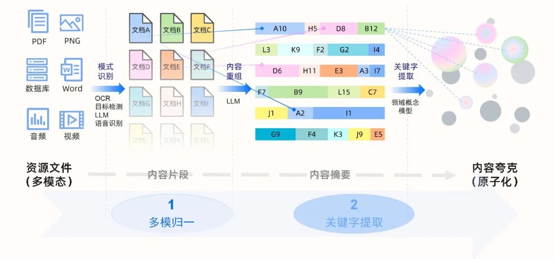 这一步骤通过集成多种先进技术实现,例如利用 OCR 技术识别图片中的文字、通过语音识别技术将音频内容转换为文本,以及运用大语言模型对文档进行语义解析。这些技术将复杂的非结构化或半结构化数据拆解为结构化的“内容夸克”,如实体、属性和关系。
