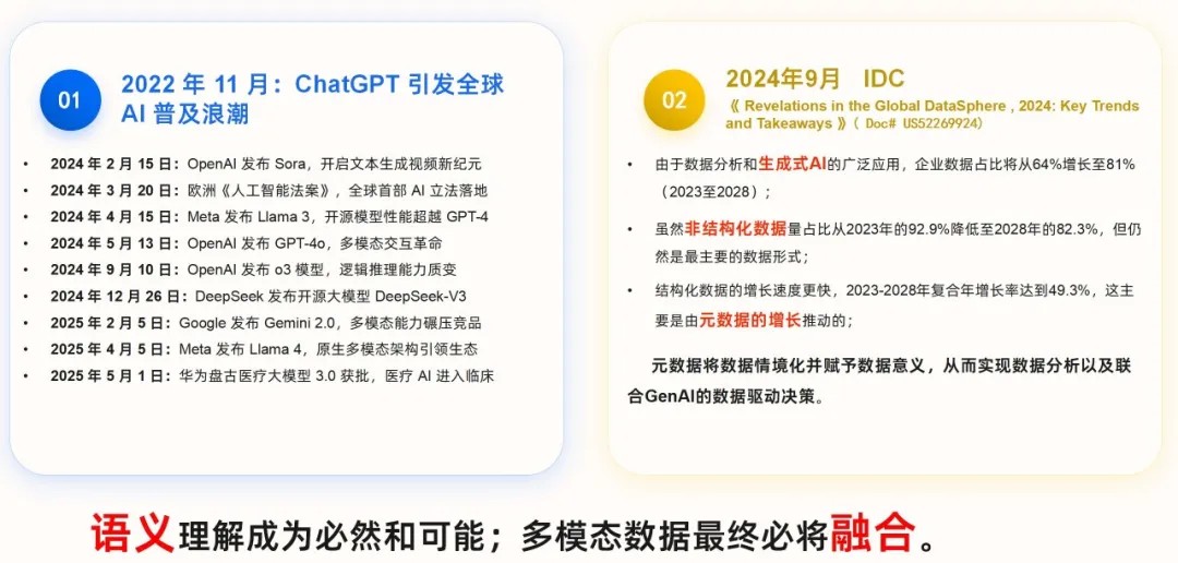 尤其在 AI 时代,系统不仅需要存储这些数据,更要像人类一样理解数据背后的语义,比如从客户的语音情绪中洞察潜在风险,从影像与病历的关联中挖掘疾病线索,并将不同模态的数据串联成有价值的信息网络。这无疑是一项全新的挑战。