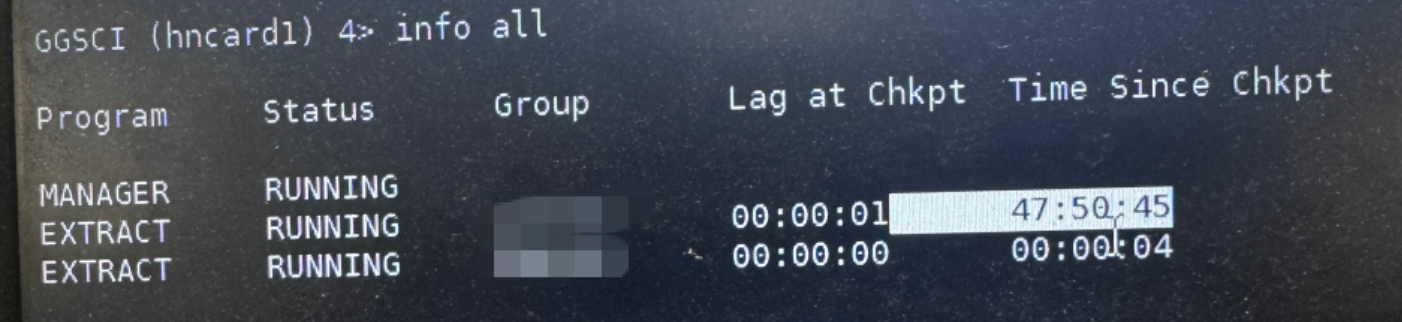 time since chkpt 抽取进程巡检发现近两天的延迟,表示ogg无法推进检查点,很大程度说明有长事务执行时间较长。