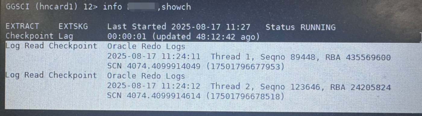 2025-08-17 11:23:08 WARNING OGG-01027 Oracle GoldenGate Capture for Oracle, xx.prm: Long Running Transaction: XID 5226.4.27923, Items 1, Extract xx, Redo Thread 1, SCN 4074.3508022147 (17501204786051), Redo Seq #88435, Redo RBA 371576848.