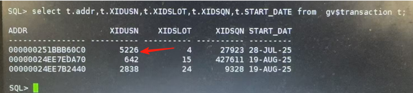 select t.addr,t.XIDUSN,t.XIDSLOT,t.XIDSQN,t.START_DATE from gv$transaction t;