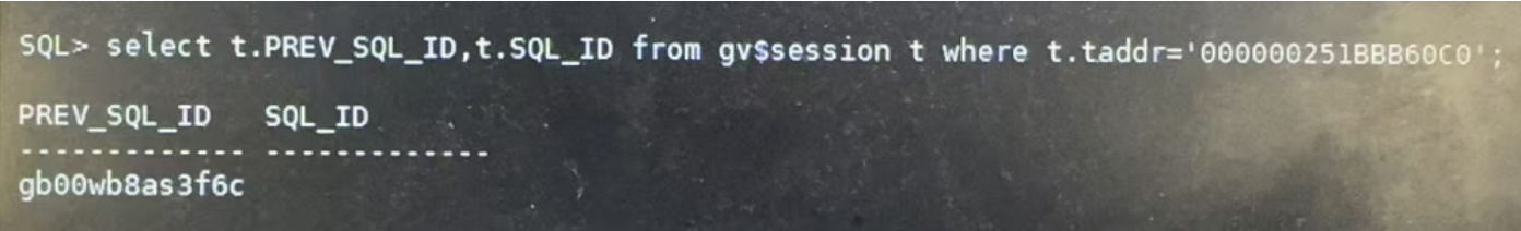 select t.PREV_SQL_ID,t.SQL_ID from gv$session t where t.taddr='xx';