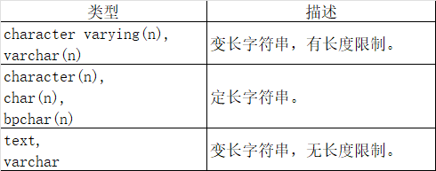 我们先来了解一下PostgreSQL中的字符串类型,PostgreSQL中支持的字符串类型如下表: