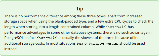 附:在PostgreSQL官方手册中,也明确指出了虽然char(n)在其他数据库中可能具有一些性能优势,但在PostgreSQL中,char(n)通常性能都不如varchar(n)或者text。