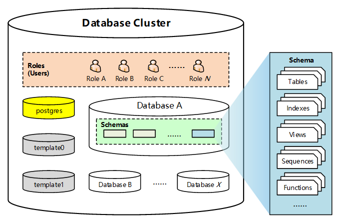数据库中的数据库对象(Table、Index、View、Sequence、Function等)必须且仅隶属于一个模式。
