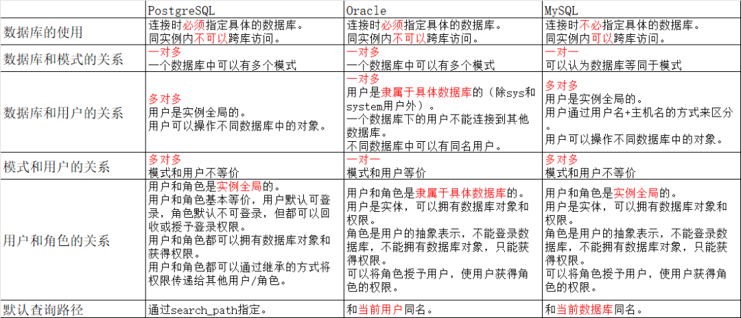 关于PostgreSQL、Oracle和MySQL三种数据库中逻辑架构,可以用下图概括: