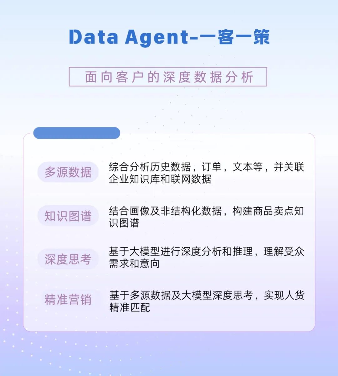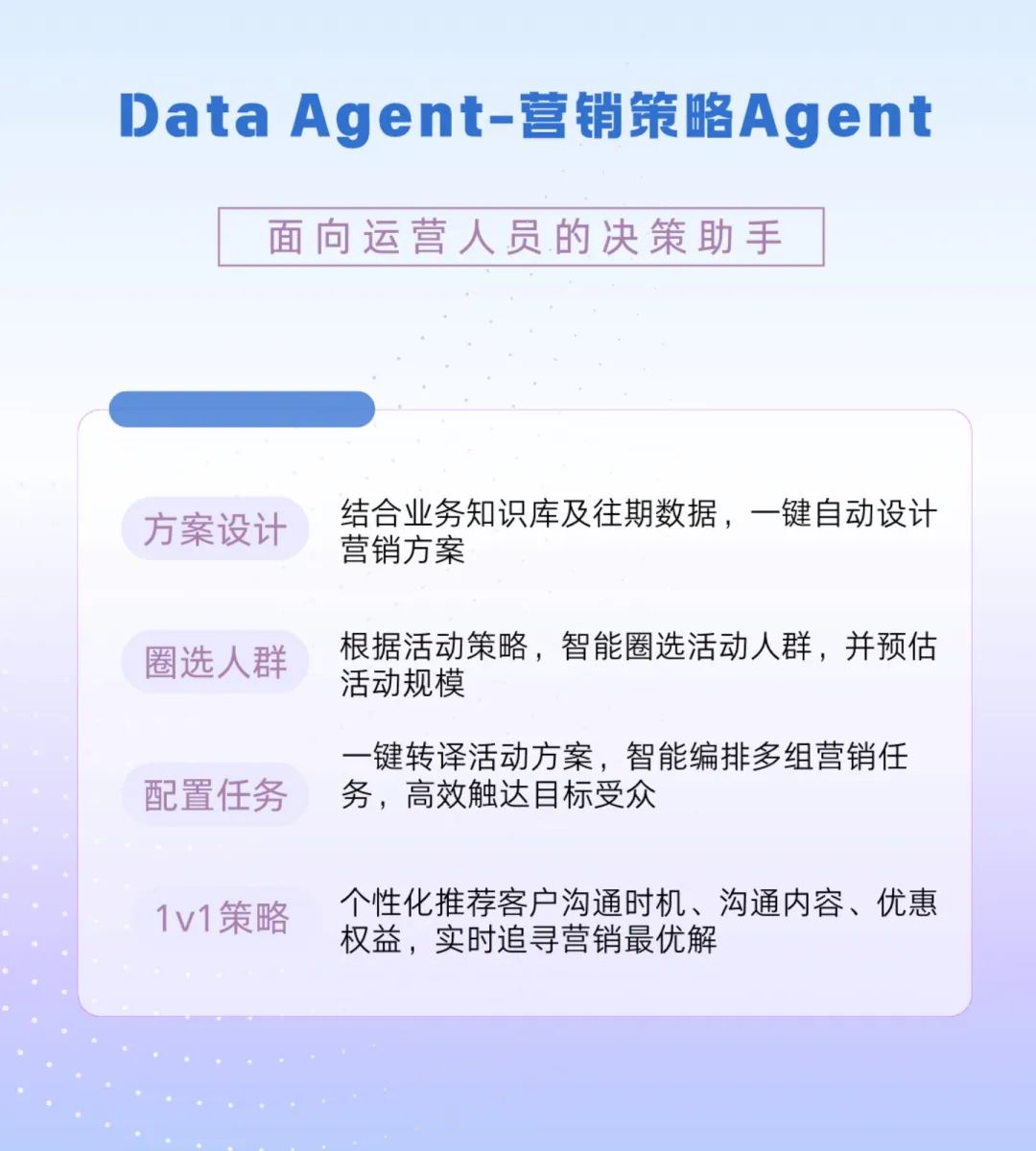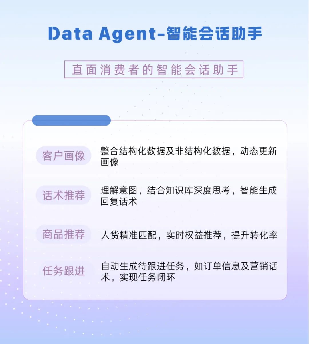 Data Agent可通过大模型与数据挖掘技术,整合企业内外部多源数据,并结合知识库与实时联网信息,为每个客户生成专属营销策略。