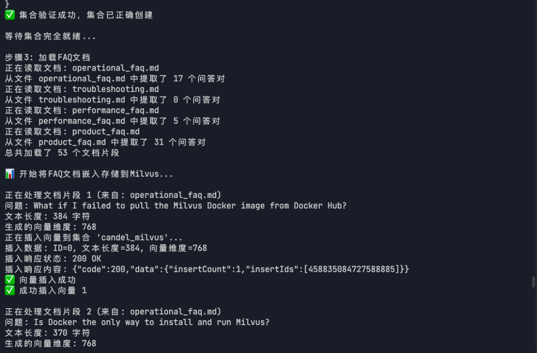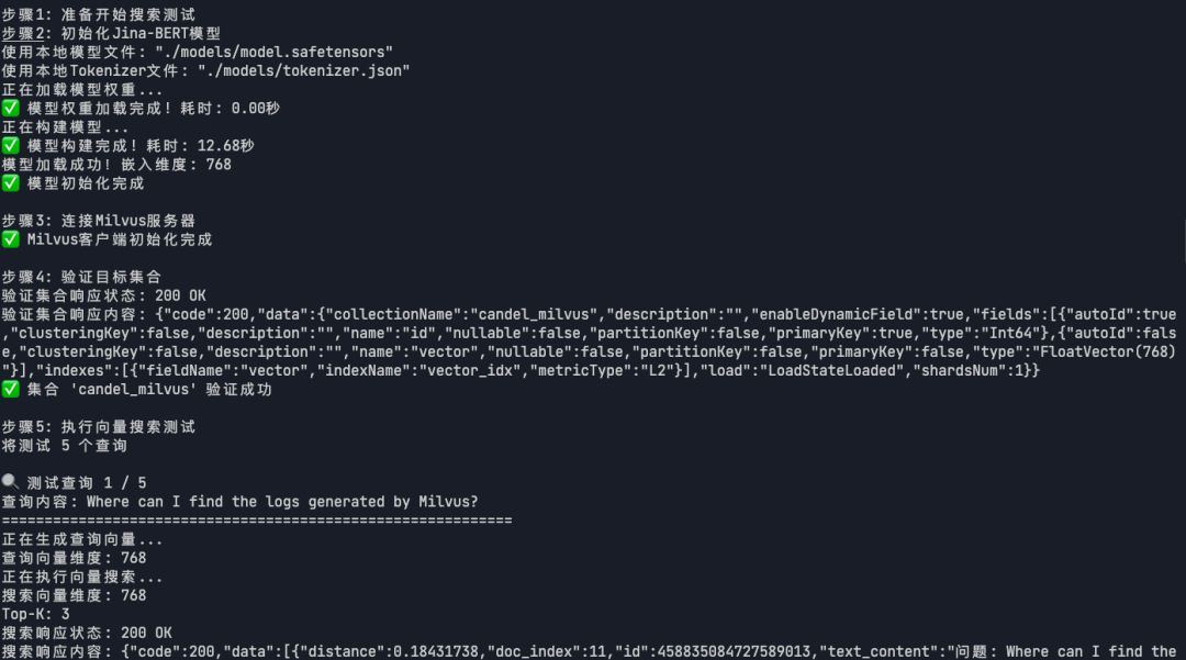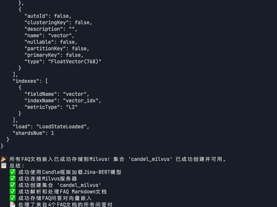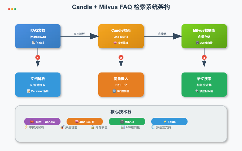 本实战基于Candle 框架和 Milvus 向量数据库FAQ检索系统。系统完全使用 Rust 生态实现,通过 Candle 框架加载 Jina-BERT 模型进行文本向量化,并使用 Milvus 进行高效的语义相似度搜索。