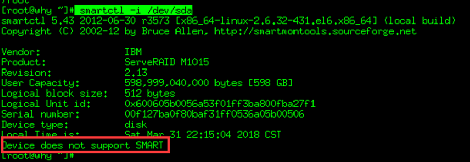 服务器硬盘是SATA的,使用下面的命令来确认硬盘是否打开了SMART支持