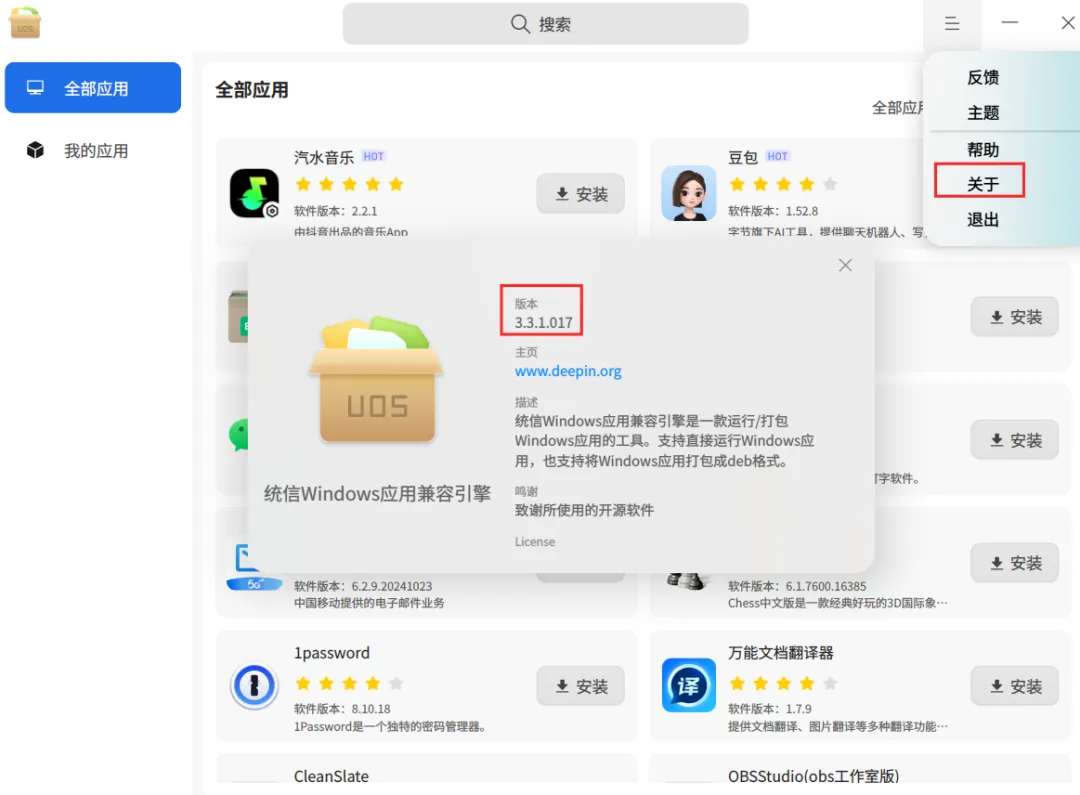 通过应用商店安装最新版「统信 Windows 应用兼容引擎」;