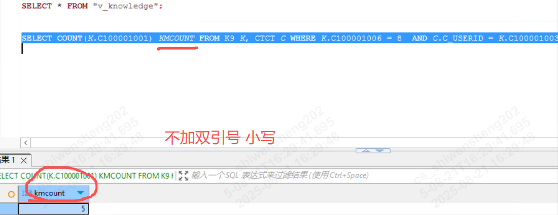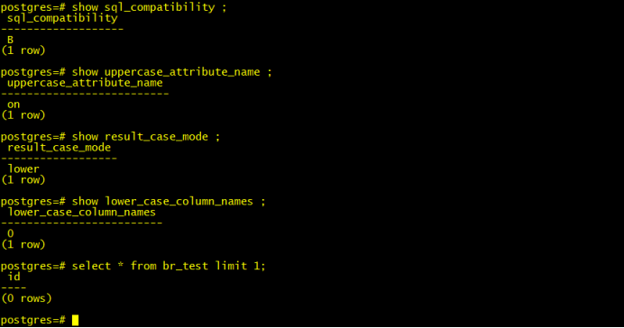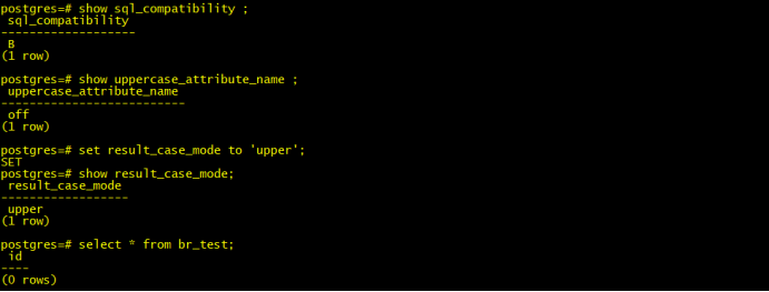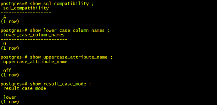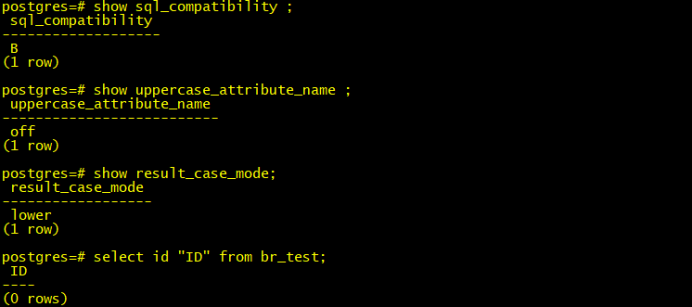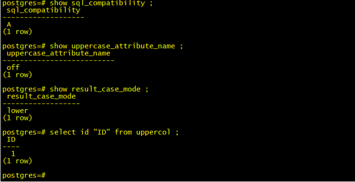 而result_case_mode仅影响返回字段的大小写形式,不影响数据库原有的大小写匹配逻辑,且该参数仅作用于会话级别,在postgresql.conf文件中配置无效,默认值是lower;