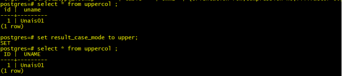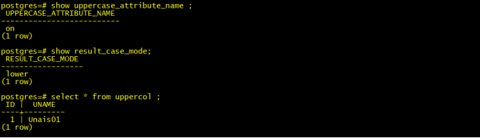 在磐维数据库中,查询返回结果中列名的大小写由参数uppercase_attribute_name或result_case_mode决定,uppercase_attribute_name控制列名是否以大写形式返回给客户端,默认为off;