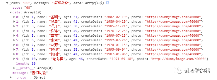 import Mock from 'mockjs'const data={code: '00',message:'查询功能','data|10':[{'id|+1':1,'name':'@cname','age': '@integer(30, 50)','createDate':'@date(yyyy-MM-dd)','photo': '@image(200*200)'}]};Mock.mock('/api/test', 'post', data)export default Mock