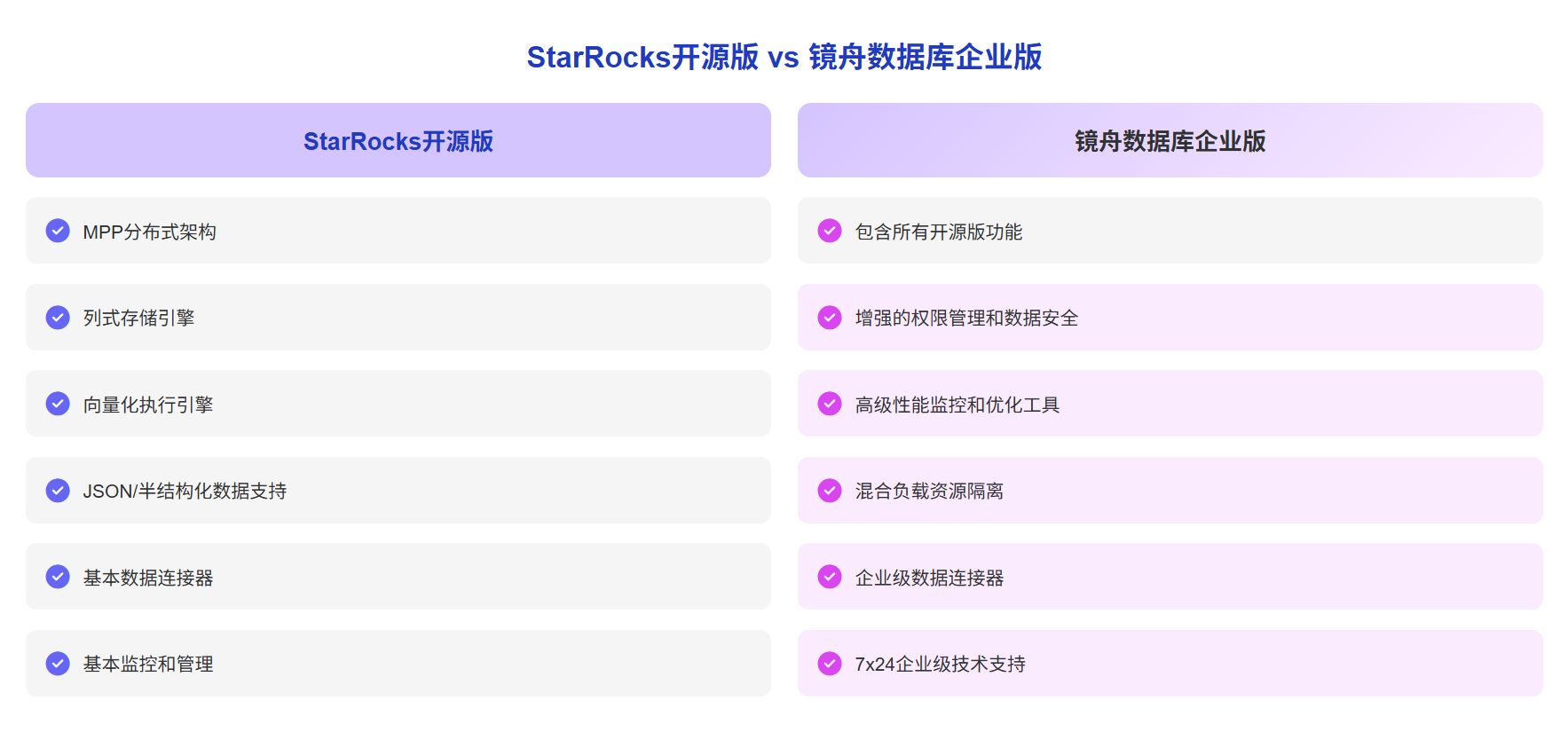 镜舟数据库企业版在开源StarRocks基础上,进一步增强了企业级功能,包括更完善的权限管理、数据安全保护、性能监控等特性。企业版特别针对混合数据负载进行了优化,能够在同一个系统中同时处理批量数据导入、实时数据流和复杂分析查询,为企业提供真正的一站式数据分析解决方案。
