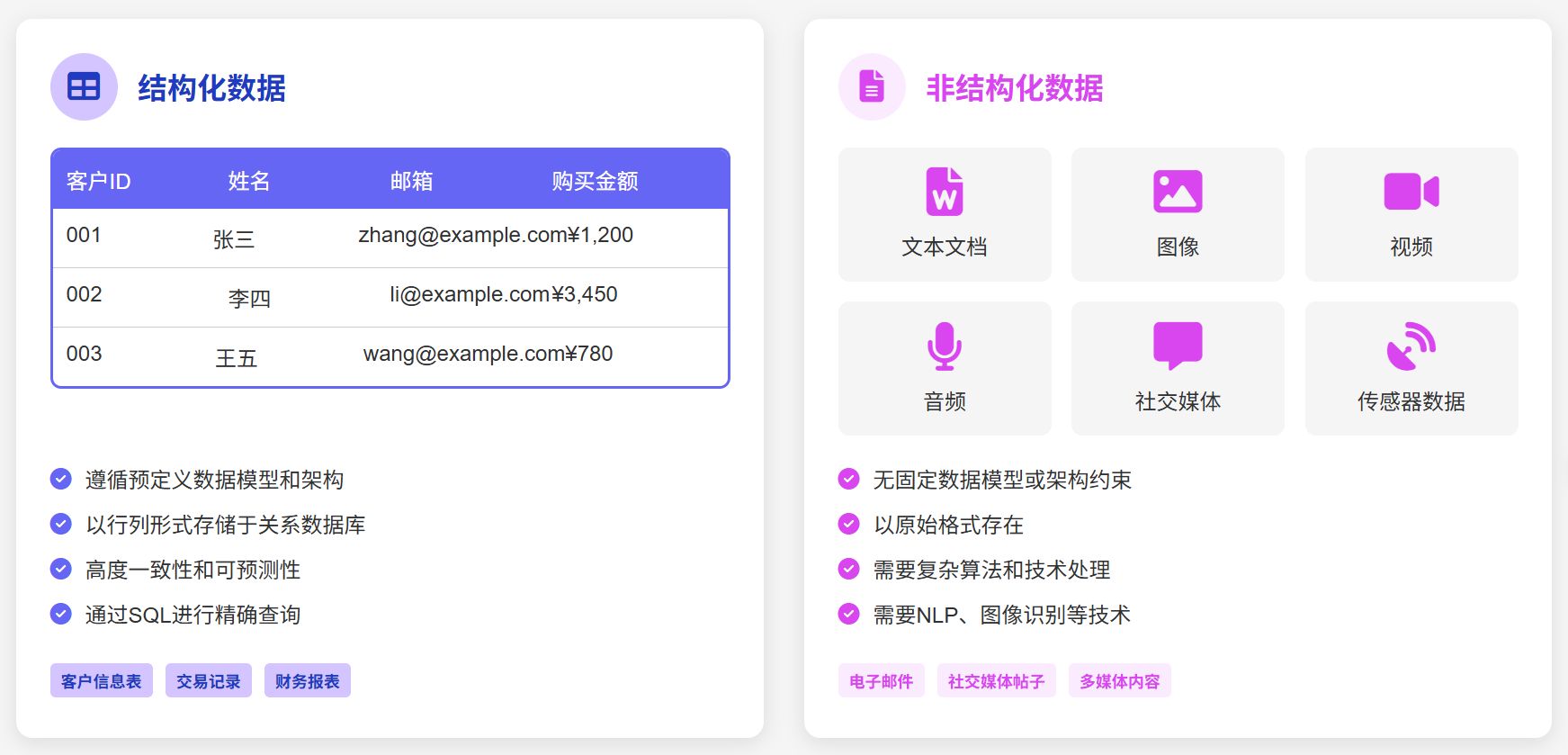 与之形成鲜明对比的是,非结构化数据没有固定的数据模型或架构约束,以原始格式存在。这类数据包括文本文档、图像、视频、音频文件、社交媒体内容、传感器数据流等。非结构化数据的处理和分析通常需要更复杂的算法和技术手段,如自然语言处理、图像识别、机器学习等。尽管处理难度较大,但非结构化数据往往包含丰富的隐含信息和业务洞察,对企业决策具有重要价值。