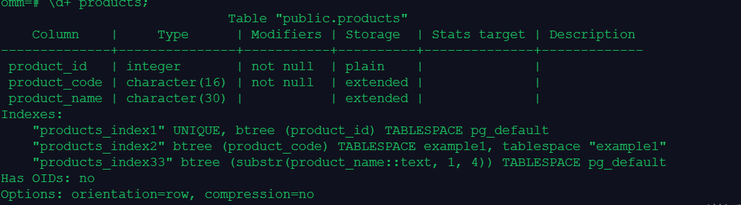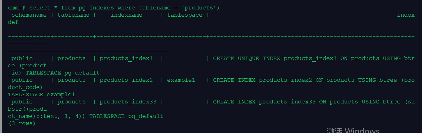 4.使用\d+和系统视图pg_indexes查看索引信息\d+ products;