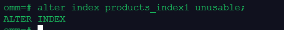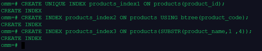 – product_code字段上创建指定B-tree索引CREATE INDEX products_index2 ON products USING btree(product_code);