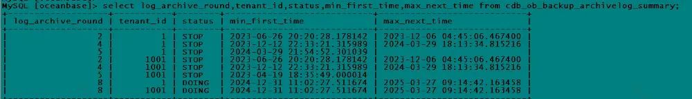 select log_archive_round,tenant_id,status,min_first_time,max_next_time from cdb_ob_backup_archivelog_summary;