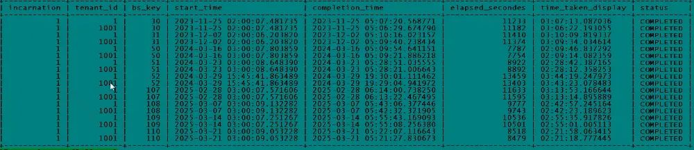 select incarnation,tenant_id,bs_key,start_time,completion_time,elapsed_secondes,time_taken_display,status from cdb_ob_backup_set_details order by start_time,tenant_id;