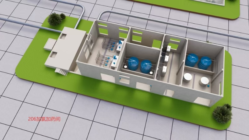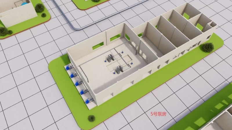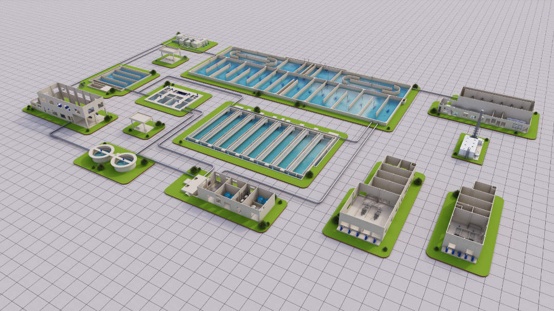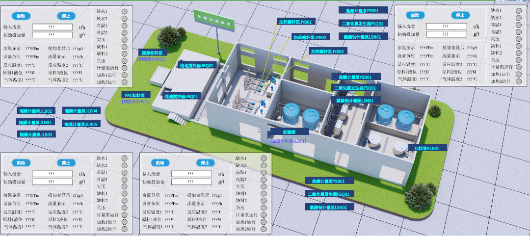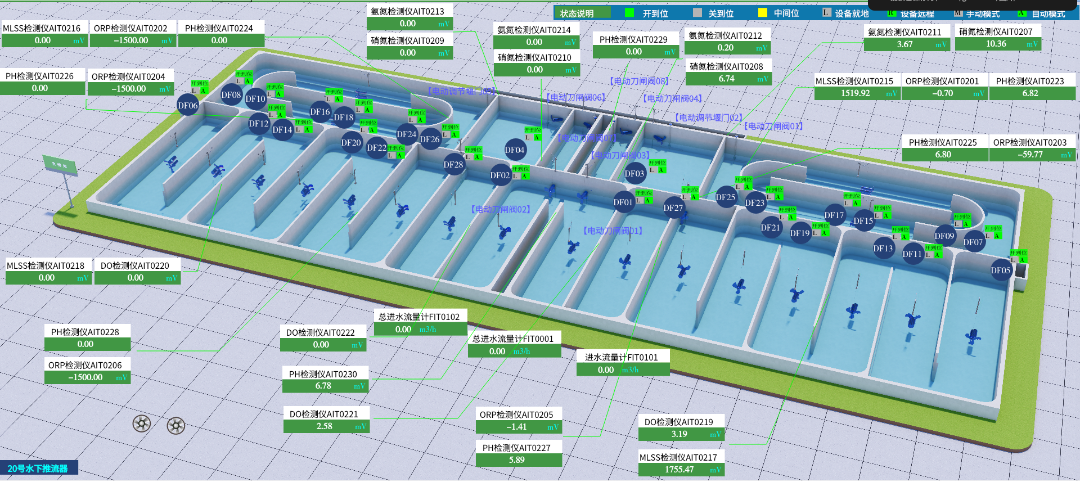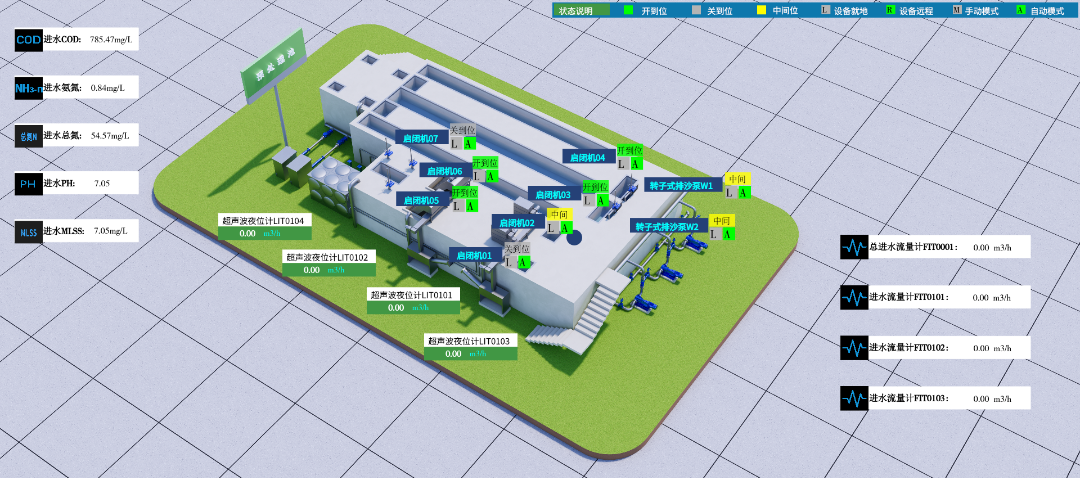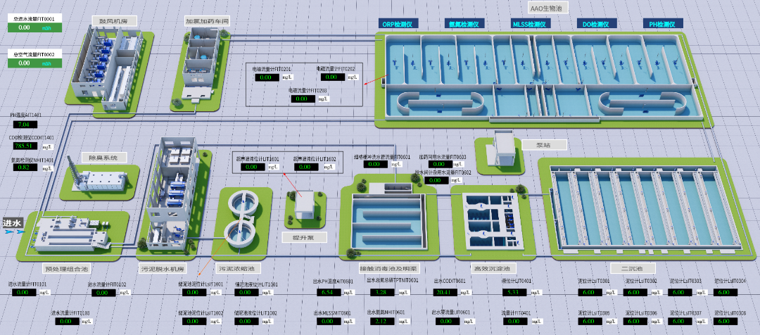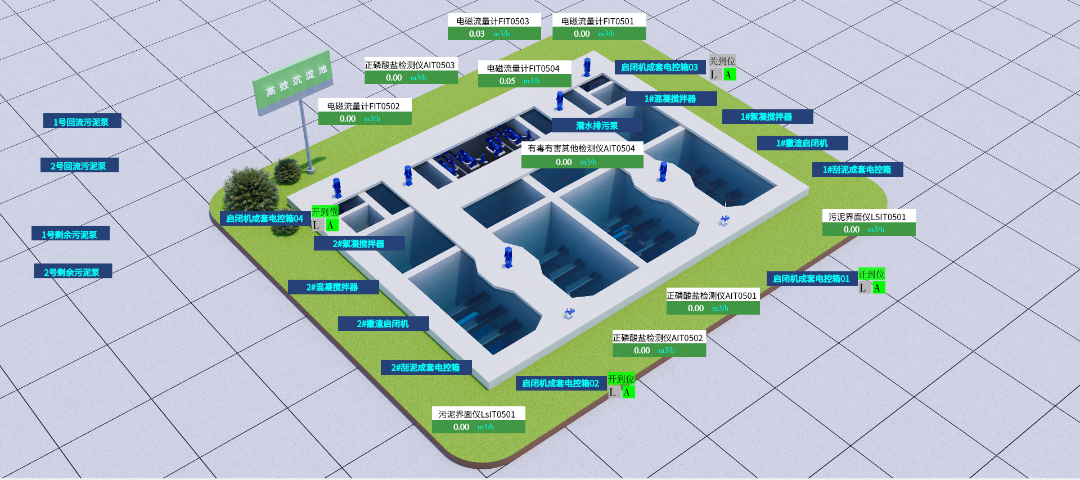 依托亚控信创SCADA监控平台KingSCADA4.0完成全厂三维工艺建模,建立了包括预处理组合池、AAO生物池、二沉池、消毒池、高效沉淀池、加药加氯间、鼓风机房、污泥脱水机房等所有工艺单体的精细化监控画面,实现了全厂生产状态的实时可视化管控。