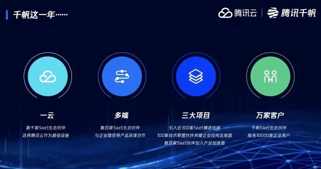 腾讯开出了一剂良药。“千帆计划”是腾讯推出的 SaaS 生态计划,该计划包括“一云、多端、三大项目”。同时,“千帆计划”在2021年4月推出了包括IDaaS 、iPaaS、aPaaS的企业连接器,分别帮助生态伙伴实现了账号互通、数据流互通、应用集成能力的提升。