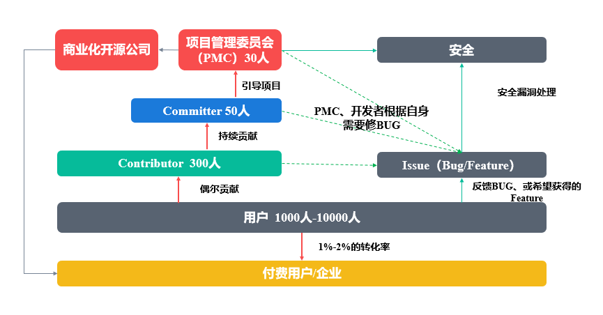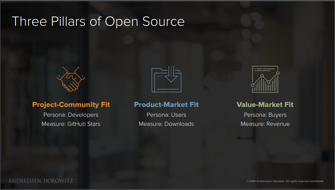 Project-Community Fit(项目社区匹配度,简称PCF):开源项目的创立多来源于个人兴趣或学术诉求。自愿为开源工作编程的人才毕竟是有限的,所有的开源项目都在主动或被动的竞争优质的资源 - 人。项目初期能否吸引更多的开发者加入,并通过社区运营来保持一定的活跃度是关键。以前Github的Star、Follow、Fork数量都是PCF的量化标准,不过由于现在淘宝上有商家可以帮忙刷量(Star和Follow 3块钱,Fork 4块钱),水分比原来多了些。 Project-Market Fit(产品市场匹配度,简称PMF):开源商业模式的主要优势便是社区用户(含开发者)有一定几率在未来转化为付费客户。但如果开源社区的PMF太低,开发者们造的轮子自然没有用户,因此是否能够吸引到足够多用户的关注度是衡量开源项目质量的关键。这个阶段,下载量或其他有关自然增长速度的量化指标都是不错的判断标准。 Value-Market Fit(价值市场匹配度,简称VMF):在验证过PCF与PMF之后,才可以谈商业化价值。开源社区重视的是核心功能而非用户体验,比如当用户在使用过程中如果遇到了问题,只能依赖在社区里提问或自己阅读文档来寻找解决方案。要记住,开源社区是没有企业服务能力的,只有商业化开源公司可以服务客户并赚取利润。这时候就需要用通用的判断标准去衡量开源公司的价值了,最直观的量化指标就是收入、增速等等。