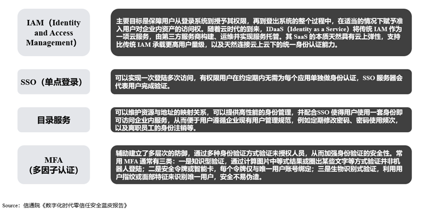 原来的技术厂商提供的服务是IAM(Identity and Access Management),即身份认证和访问管理。进入云原生时代后,IDaaS(Identity as a Service)出现的频率更高些了,即身份即服务。二者的直接差别是IDaaS更适用于云环境,用SaaS的方式交付多一些。IDaaS主要解决的问题就是可以用一套账号安全地帮助企业拉通其内部ERP、CRM、IT运维、邮件等系统各自独立的账号体系。身份安全关键技术如下图所示: