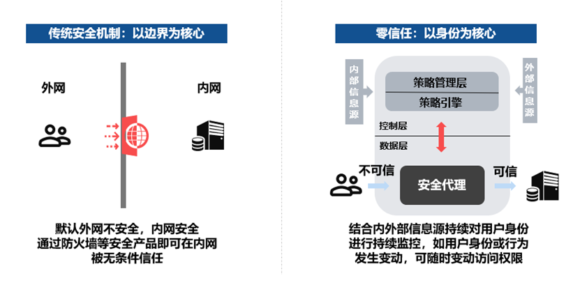 零信任的意思是不能信任出入网络的任何内容,即要对进入网络的所有身份进行验证。传统安全架构以网络边界为核心,零信任则以身份为核心,具体区别如下: