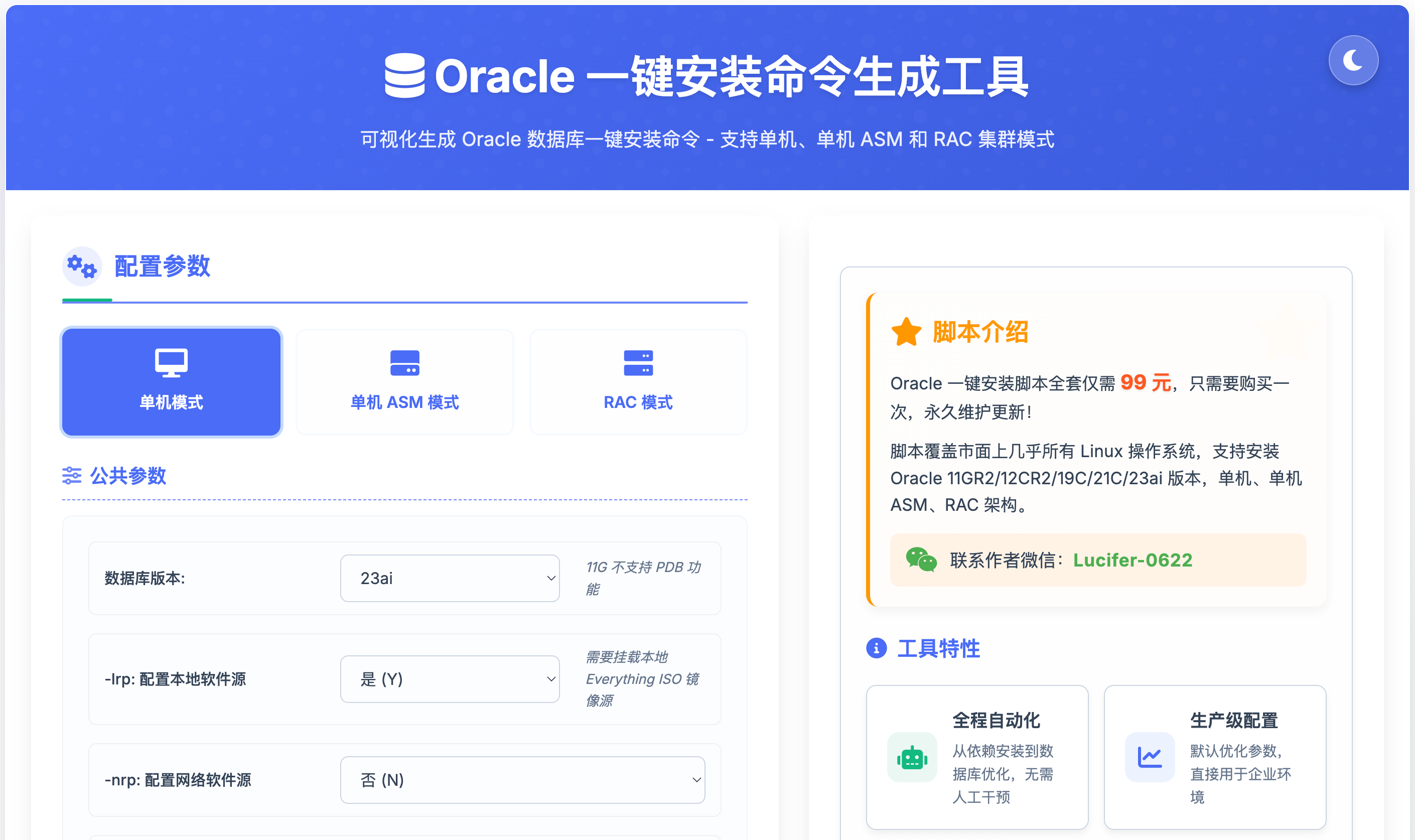 使用我配套开发的 Oracle 一键安装命令生成工具 可视化填写参数,获取一键安装命令: