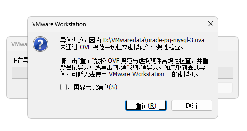 由于visualbox导出的文件不完全兼容vmware,这时会提示导入失败,点击“重试”就能导入。