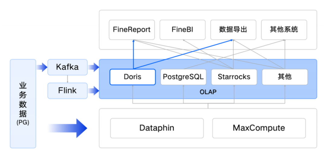 离线链路:MaxCompute 存储 T+N 离线数据,通过 Dataphin 全量 增量导入 SelectDB,同时在合适时机触发异步物化视图刷新,让离线报表查询速度得以提升。