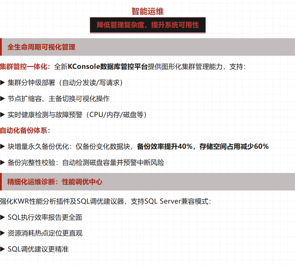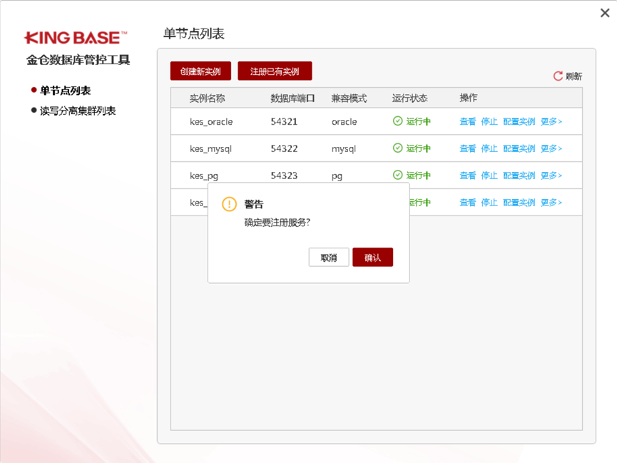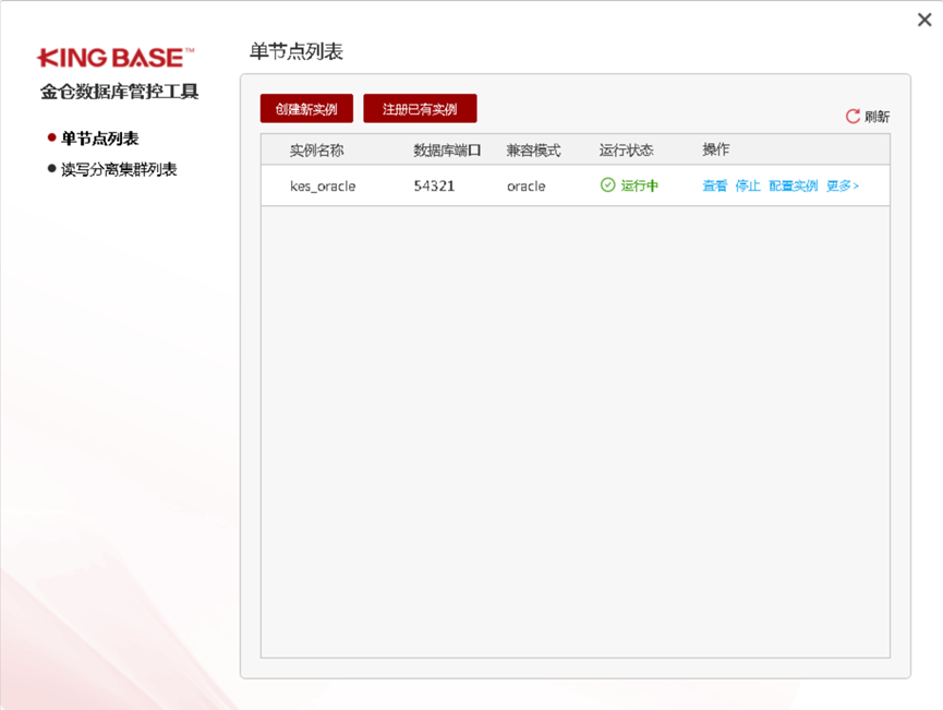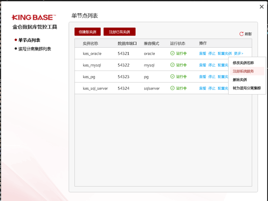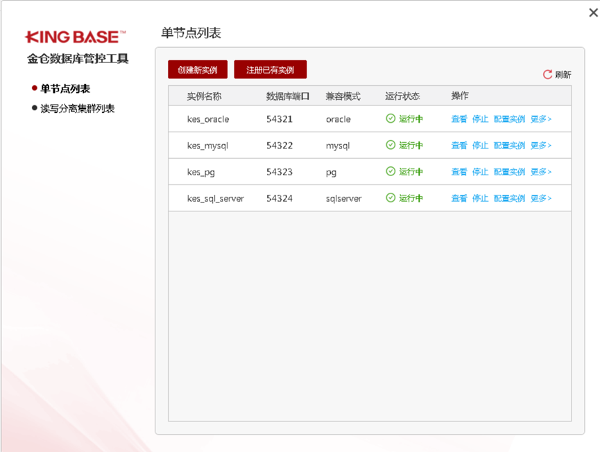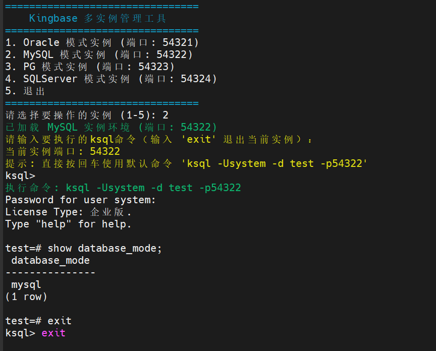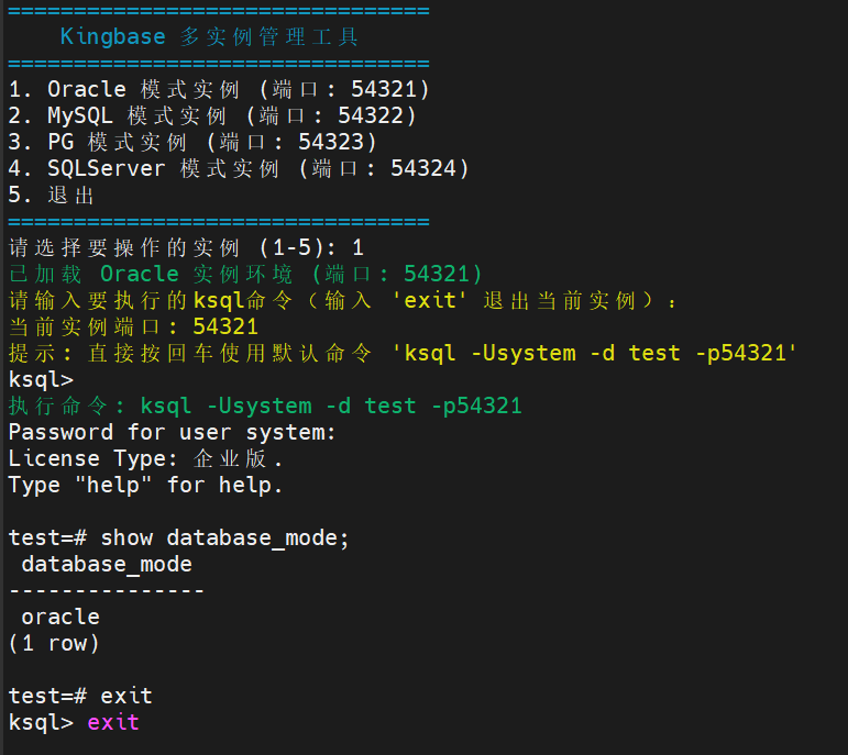 8月中旬,金仓数据库全平台版本KingbaseES V9正式发布,该版本面向全市场发布,具备Oracle、MySQL、SQL Server、PostgreSQL四种兼容模式,在保留前序版本能力基础上,重点强化SQL Server能力兼容。今天有时间进行安装了一下V9新版本,确实是感觉到了不一样,因前面安装多次,所以本次不在过多介绍前期准备和配置操作了,新版本安装过程中与之前版本差异如下:首先是进度条,以及安装组件时的细化,另外就是下图可以创建快捷方式,以及提示使用Kconsole 图形化工具进行初始化数据库。接下来我们使用Kconsole来进行创建实例(其实不止创建实例一项功能)选择执行即可,也就1-2min 甚至更快就可以创建完成了。可以看到已经创建成功了。根据上述操作,我们依次创建其他兼容模式的实例:可以看到Kconsole可以对已有实例进行配置操作:同时也可以使用Kconsole进行将实例注册为系统服务,即之前执行的root.sh将实例设置成开机自启服务。根据官方发布内容可知,版本 V009R001C010有很多新特性,比如大家关注的兼容:刚刚我们实现了,在一台机器使用部署了四个不同兼容模式的实例,那么我们要如何快速的访问和登录呢?为此我写了一个管理工具脚本可以进行快速、准确的连接访问到具体的实例,而防止误操作,造成数据丢失。使用如下图:PS:如果有需要脚本的伙伴们,可以联系作者进行获取哦。