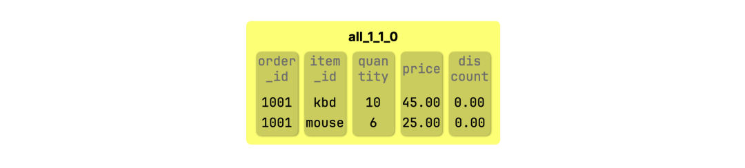 每个分片包含若干行数据(按列存储),并根据其在插入和合并历史中的位置命名。例如,向一个初始为空的 orders 表插入包含 order_id、item_id、quantity、price 和 discount 列的数据后: