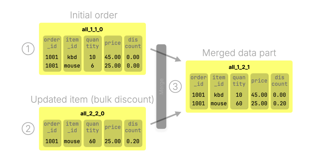 下图展示了最初插入(①)和更新插入(②)所创建的 数据分片(https://clickhouse.com/docs/parts)。在下一轮 后台合并(https://clickhouse.com/docs/merges)(③)中,ClickHouse 会自动丢弃旧版本,只保留最新的记录: