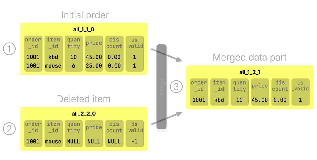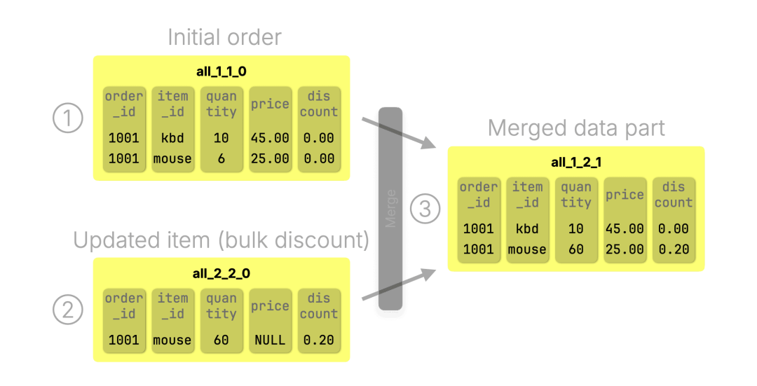 当后台将 ① 初始插入和 ② 更新插入进行合并时,会生成一个新的数据分片 ③,ClickHouse 会针对每一列保留最新的非空值,从而将多条部分更新记录合并为一条完整记录。合并完成后,① 和 ② 分片将被丢弃,整个流程与 ReplacingMergeTree 相同: