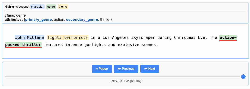 print("\n2. Extracting tags from documents...")# Define extraction prompt - for movie descriptions, specify attribute value rangesprompt = textwrap.dedent("""\Extract movie genre, main characters, and key themes from movie descriptions.Use exact text for extractions. Do not paraphrase or overlap entities.For each extraction, provide attributes with values from these predefined sets:Genre attributes:- primary_genre: ["action", "comedy", "drama", "horror", "sci-fi", "fantasy", "thriller", "crime", "superhero"]- secondary_genre: ["action", "comedy", "drama", "horror", "sci-fi", "fantasy", "thriller", "crime", "superhero"]Character attributes:- role: ["protagonist", "antagonist", "supporting"]- type: ["hero", "villain", "detective", "military", "wizard", "scientist", "friends", "investigator"]Theme attributes:- theme_type: ["conflict", "investigation", "personal_growth", "technology", "magic", "survival", "romance"]- setting: ["urban", "space", "fantasy_world", "school", "forest", "victorian", "america", "future"]Focus on identifying key elements that would be useful for movie search and filtering.""")