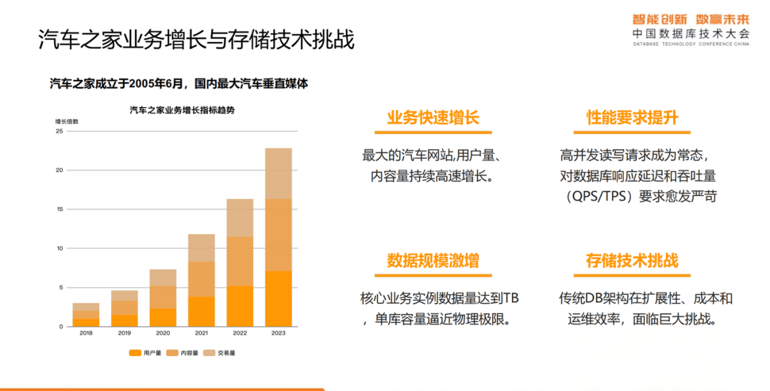 作为国内领先的汽车互联网平台也是目前国内最大的汽车垂直媒体,汽车之家在“看车、买车、用车”全链条上积累了海量的用户、内容与交易数据。伴随业务持续扩张,数据库系统逐渐成为整个业务发展的关键瓶颈: