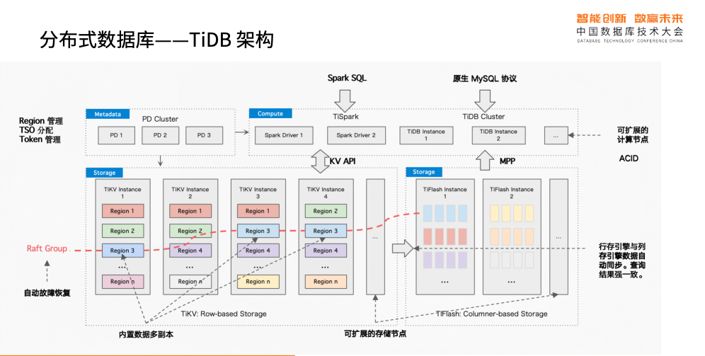 架构优势:行存(TiKV)与列存(TiFlash)结合,原生支持 HTAP;通过 PD 调度实现全局事务一致性。