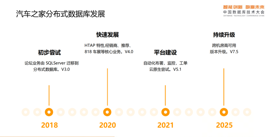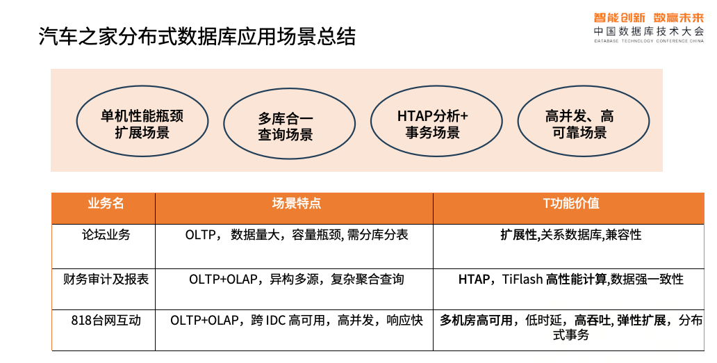 结合行业趋势与数据库技术对比,分布式数据库不仅能提供更强的水平扩展和高可用能力,还能在 HTAP 场景下兼顾事务与分析。因此,汽车之家在系统演进中选择使用分布式数据库作为支撑论坛、财务报表、车展等核心业务的下一代数据库底座。