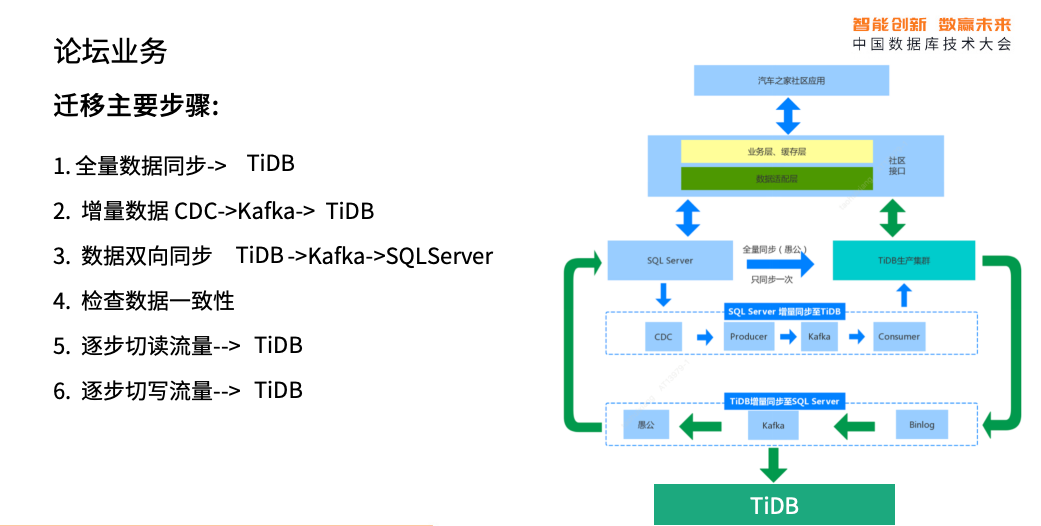 解决方案:通过 TiDB 实现透明扩展,替代原有 SQL Server,避免分库分表复杂性。迁移过程中采用 全量同步 + CDC 增量同步(Kafka)+ 双向校验 + 分步切读/切写流量 的方式,保证数据一致性与业务平滑过渡。