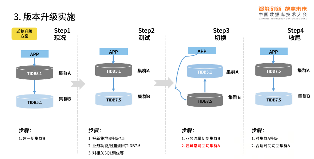 汽车之家遇到的问题包括:旧版本 OOM 风险、跨机房同步异常、大表加索引缓慢。在 TiDB 版本升级过程中,重点从以下五大维度考量升级决策: