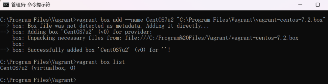 也可用本地环境已有的 box 文件(同样地,需放在 Vagrant 的安装目录),注意在添加 box 时,要与之前在 vagrantfile 中配置的名称保持一致,此处名为 CentOS7u2。